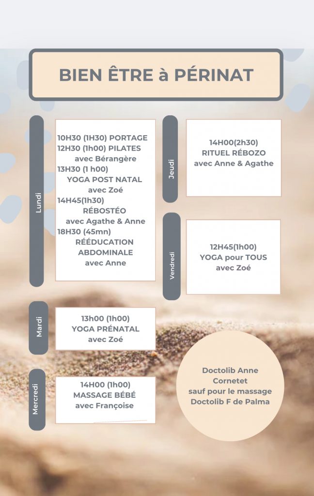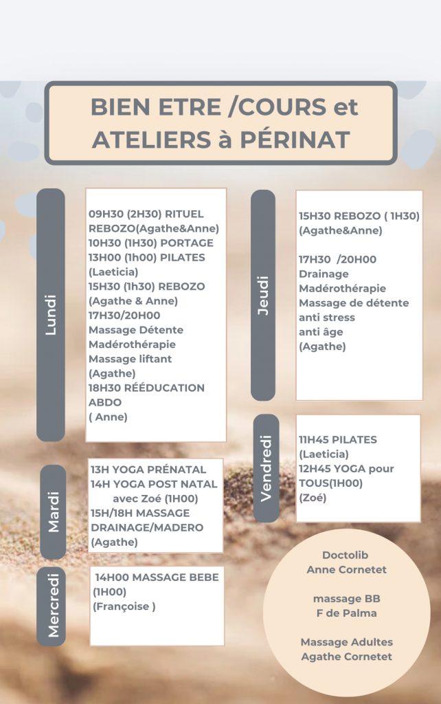 Tout au long de l’année, nous organisons des ateliers pratiques et rencontres conviviales animés par des professionnelles spécialisées en périnatalité. Au programme : Ateliers de préparation à la naissance et à la parentalité Séances de yoga prénatal et postnatal Ateliers massage bébé et bain sensoriel Cercles de paroles pour futures et jeunes mamans Ateliers nutrition et santé féminine Chaque atelier est pensé pour vous accompagner avec bienveillance, que vous soyez enceinte, jeune parent ou en quête d’un moment de détente et de partage.